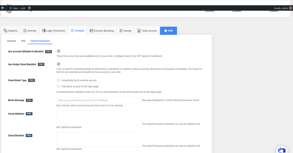 Sledeći tab je Firewall, koji pod sobom ima tri pod-taba: General, 2FA i Cloud Protection. Pod ovom opcijom imate na raspolaganju veliki broj opcija za blokiranje i filtriranje mrežnog saobraćaja. Najveći broj tih opcija je dostupan samo u PRO verziji plugina, ali su i besplatne opcije sasvim dovoljne za većinu korisnika.