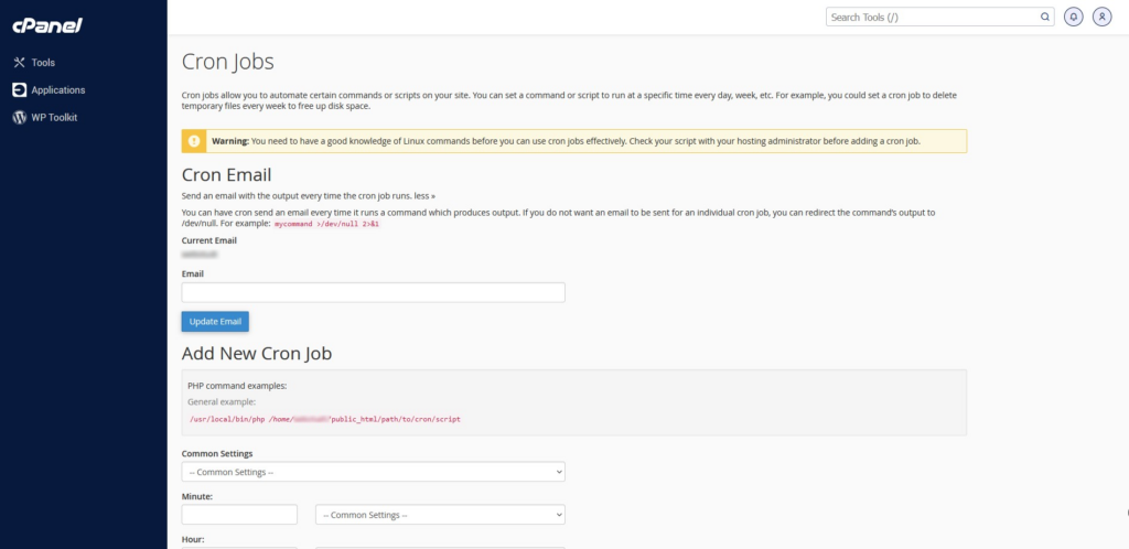 Da biste kreirali cron job u cPanel-u skrolujte ispod polja za unos email-a. Tu se nalazi sekcija pod nazivom Add New Cron Job. Ovde treba da uneste podatke kada i u kojim intervalima želite da se izvršava cron job koji ćete kreirati.