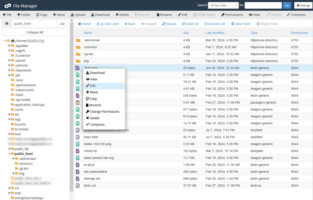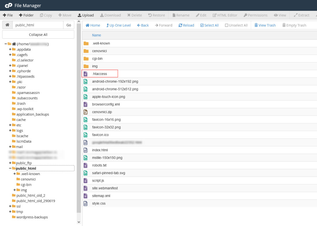 Pronađite .htaccess fajl. Napomena: .imajte u vidu da htaccess po defaultu nije vidljiv, pa da biste mogli da ga vidite, kliknite na Settings u gornjem desnom uglu prozora. Otvoriće vam se prozor Preferences. Samo čekirajte opciju Show hidden files i kliknite na Ok. Sada će .htaccess fajl postati vidljiv na lokaciji public_html.