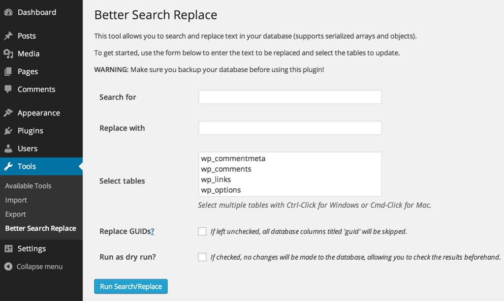 Instalirajte i aktivirajte plugin, a zatim idite na Tools → Better Search Replace
