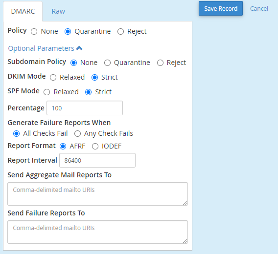 Napomena: Ukoliko podešavate DNS zapise za vaš domen na nekom drugom mestu (npr na nekom CDN-u ili nekom drugom DNS provajderu), moraćete da kopirate ove zapise kod vašeg DNS provajdera. Možete da pogledate RAW DMARC zapis da biste ga kopirali i dodali ga u polja gde upravljate vašim DNS-om.