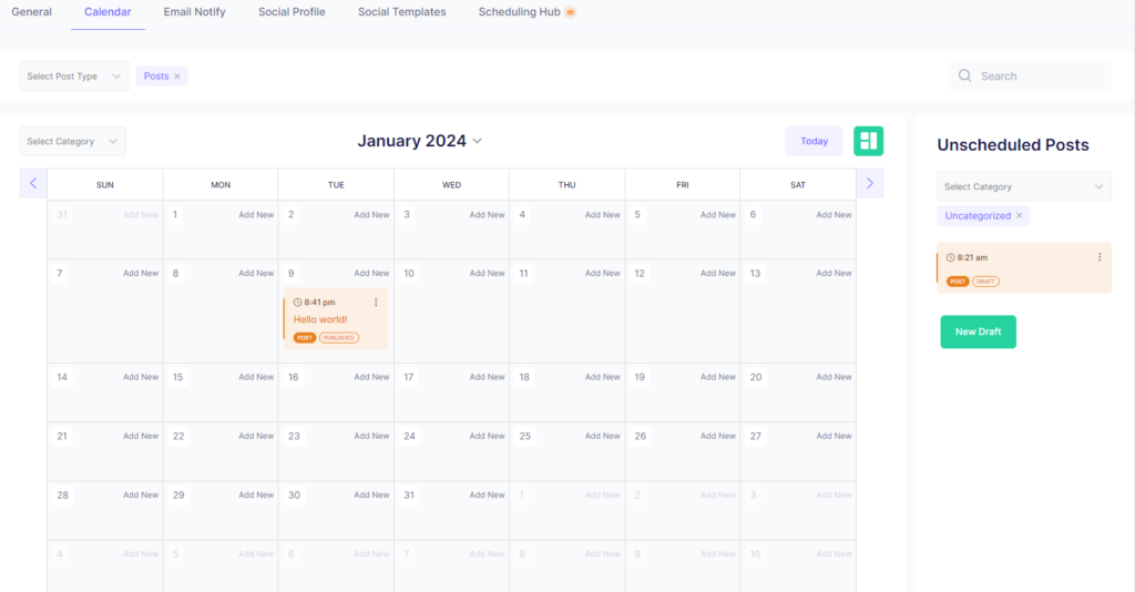 Na desnoj strani ekrana, videćete opciju New Draft kojom kreirate novi draft, a u okviru kalendara videćete objasve koje već imaju određeni status (published, scheduled ili draft). Klikom na Add New unutar nekog polja datuma možete kreirati novi post i postaviti da se objavi u tačno određeno vreme određenog datuma.