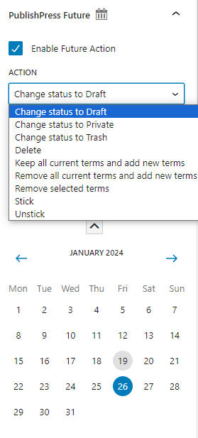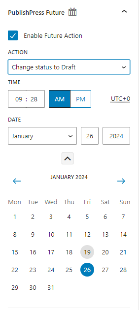 Ako želite da zakažete datum isteka nekog posta na određeni datum i vreme, možete da koristite plugin pod nazivom PublishPress Future. Ovaj plugin vam omogućava da zakazujete datum isteka posta, a zatim će promeniti status posta u Pending, Draft ili Private u zavisnosti od toga šta izaberete.