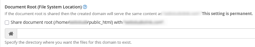 Za razliku od alias domena, ovde ne treba deliti Document Root sa glavnim sajtom. Opcija za deljenje foldera mora ostati isključena, jer poddomen treba da ima sopstveni prostor za fajlove.