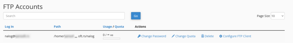 U sekciji FTP Accounts možete da promenite lozinku postojećeg FTP naloga klikom na opciju Change Password, ili potpuno uklonite nalog klikom na Delete.