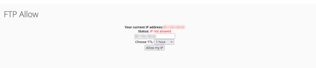 Nakon otvaranja, prikazuje se vaša trenutna IP adresa i njen status, kao i opcija kojom na dalje odobravate svoju IP –Allow my IP. Choose TTL opcija vam daje mogućnost definisanja Time-To-Live opcije, tj. vreme na koliko odobravate FTP konekciju sa navedene IP adrese