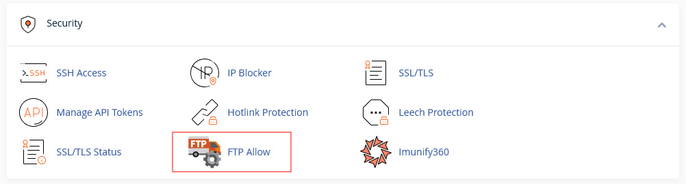 Da biste otvorili ovu opciju, potrebno je da se prijavite u cPanel, a zatim u okviru sekcije Security kliknete na opciju FTP Allow.