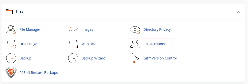 Nakon prijave u cPanel pronađite sekciju Files, a zatim kliknite na opciju FTP Accounts.