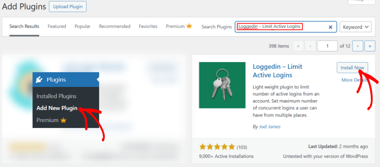 Kako smo već pomenuli Loggedin je besplatan plugin. Da biste ga instalirali dovoljno je da se ulogujete admin dashboard svog web sajta i idete na opciju All Plugins → Add New Plugin i u WordPress repozitorijumu plugina, u polju za pretragu, ukucate Loggedin i pritisnete Enter.