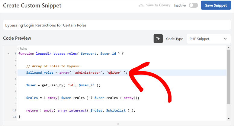 Zatim, ponovo idite na liniju koda koja počinje sa “$allowed_roles = array”, gde ćete videti unapred postavljene uloge poput administrator i editor. Možete zameniti ovaj tekst odgovarajućim ulogama koje se primenjuju na vašem sajtu.