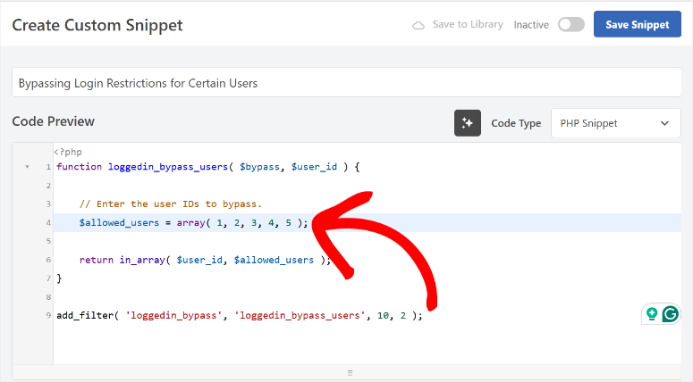Zatim idite na liniju koda koja počinje sa “$allowed_users = array”, i zamenite brojeve stvarnim ID-ovima korisnika kojima želite da omogućite zaobilaženje pravila za prijavljivanje.