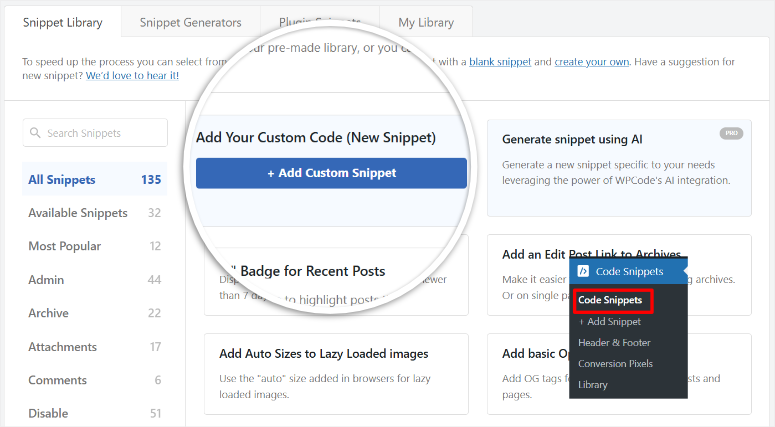 Ovo će vas preusmeriti na biblioteku sa više od 130 unapred pripremljenih kodova. Ovde izaberite opciju Add Your Custom Code (New Snippet) da biste otvorili prozor za odabir tipa koda.