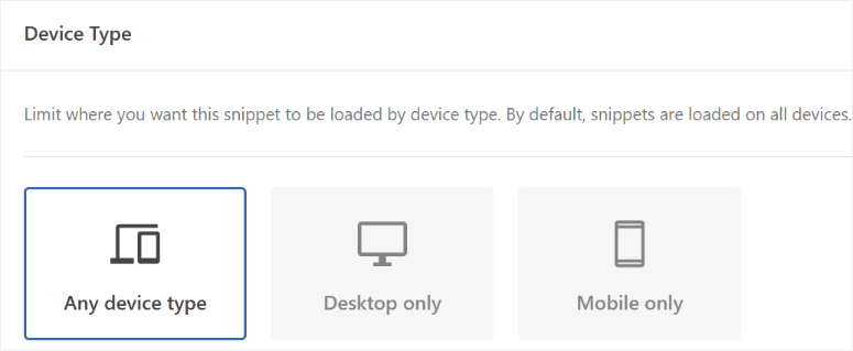 Na kraju, idite na opciju Device Type i izaberite da li želite da se kod primenjuje na Any Device (bilo koji uređaj), Desktop Only (samo na desktop uređajima) ili Mobile Only (samo na mobilnim uređajima).