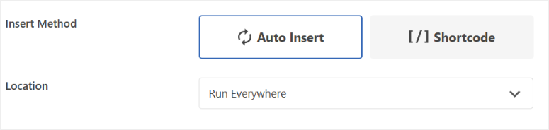Ovde idite na opciju Insert Method, gde možete odabrati da ubacite kod pomoću opcija Auto Insert (automatskog ubacivanja) ili Shortcode. Zatim koristite padajući meni Location kako biste odredili gde na sajtu želite da se kod primeni.