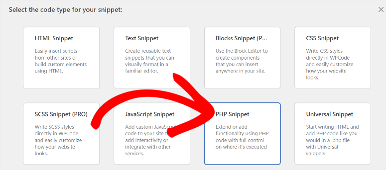 Zatim, u ovom prozoru izaberite opciju PHP Snippet kako biste otvorili interfejs za prevlačenje i ubacivanje koda.