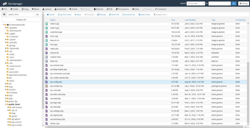 U stabli direktorijuma sa leve strane pronađite direktorijum pod nazivom public_html i označite ga. Sa desne strane će vam se otvoriti sadržaj tog direktorijuma. Među tim fajlovima bi trebalo da vidite i wp-config.php fajl.