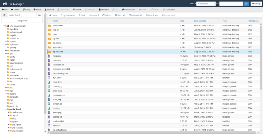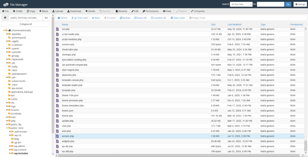 Ako niste sigurni gde da pronađete wp-includes/version.php, on se nalazi u root folderu vašeg sajta. Kao i u prethodnoj sekciji, ulogujte se na vaš cPanel nalog i idite na sekciju Files, pa zatim odaberite ikonicu File Manager. Zatim u public_html pronađite direktorijum pod nazivom wp-includes.