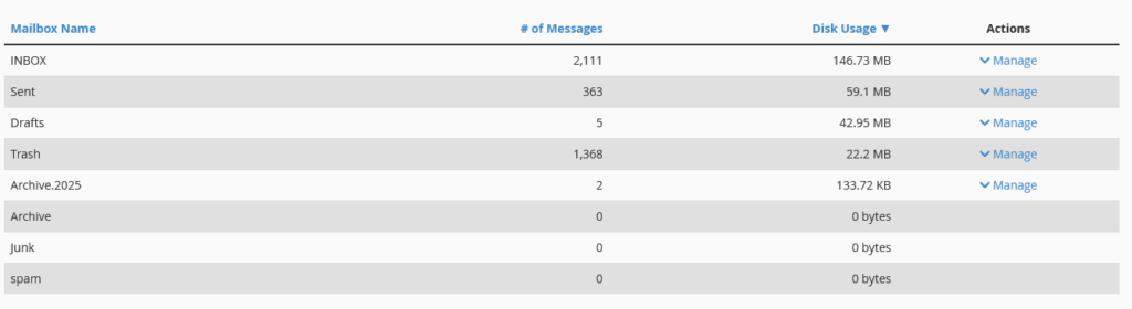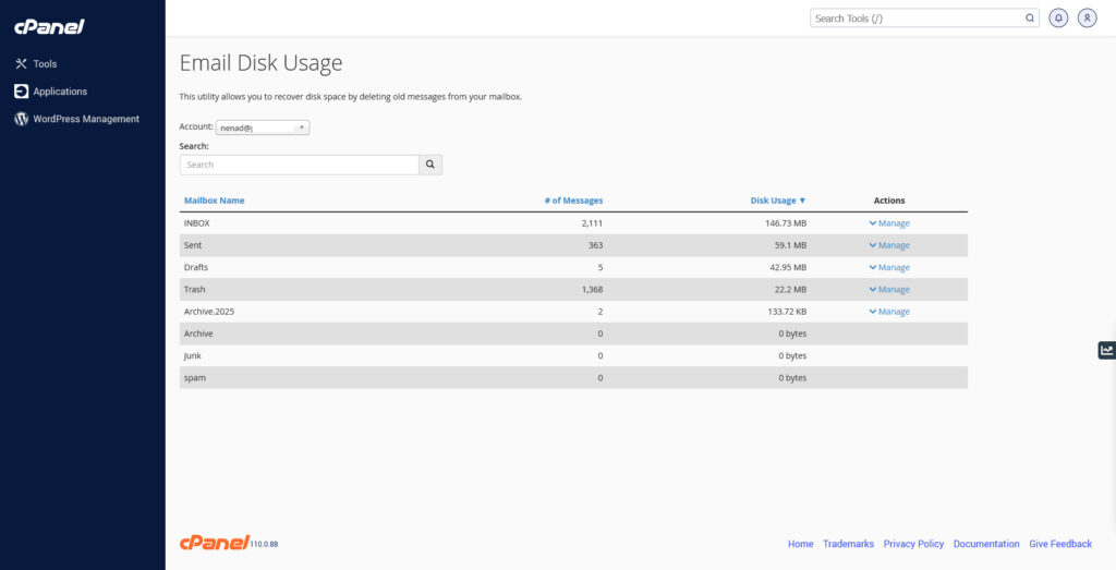 Ako ste primetili da vaš hosting nalog počinje da zauzima više prostora nego ranije, jedan od najčešćih uzroka su upravo e-mail nalozi. Svaki primljen i poslat e-mail, kao i svi njihovi prilozi se čuvaju na serveru i vremenom mogu da zauzmu dobar deo raspoloživog prostora na vašem hosting nalogu.