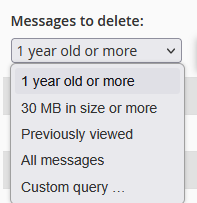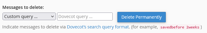 Ova opcija vam omogućava da obrišete poruke na osnovu precizno definisanih uslova, koristeći Dovecot query format. Ovo je korisno kada želite da obrišete samo određene poruke, na primer po starosti, veličini ili kombinaciji više kriterijuma.
