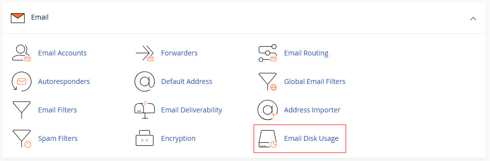 Nakon što se prijavite na svoj cPanel nalog pronađite sekciju Email, a zatim kliknite na opciju Email Disk Usage.