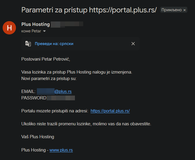 Nakon što ste kliknuli, poruka sa novom lozinkom će izgledati ovako.