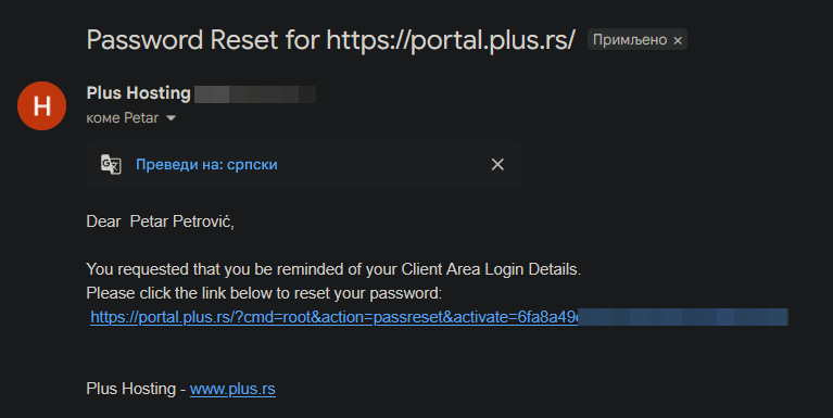Klikom na link u e-mailu potvrđujete promenu lozinke. Nakon ovoga stići će Vam još jedna poruka sa novom lozinkom.